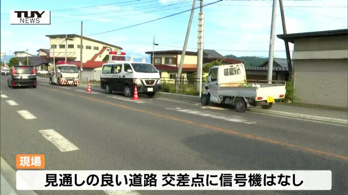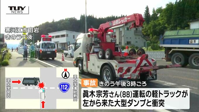 警察によりますと、この事故はきのう午後3時ごろ寒河江市白岩の国道112号で、近くに住む88歳の農業、眞木宗芳さんが軽トラックで十字路交差点を進んでいたところ左から来た大型ダンプと出会い頭に衝突したものです。