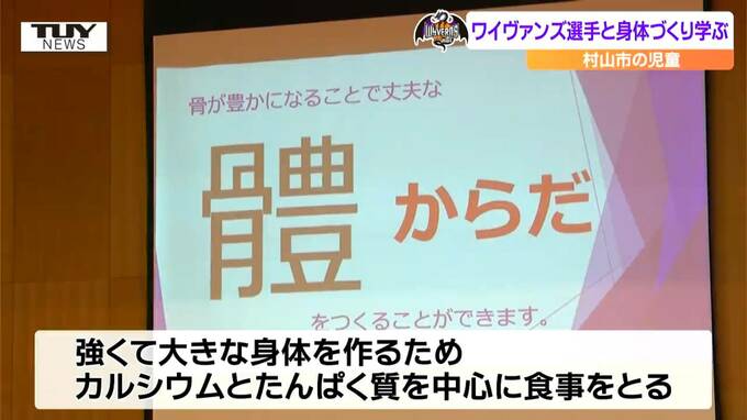 児童は、強くて大きな身体を作るためにはカルシウムとたんぱく質を中心に食事をとることが大切だと知り、選手からも量を取るだけではなく、自分の身体に合ったバランスを考えた食事をとることの必要性が伝えられました。