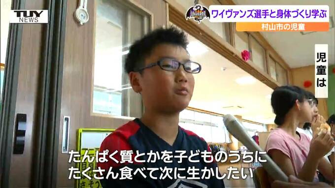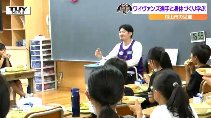藤井響樹アナウンサー「ワイヴァンズの選手を囲むように、子どもたちが一緒に給食を食べています。子どもたちの視線を一身に浴びながら、給食を楽しんでいるようです」
