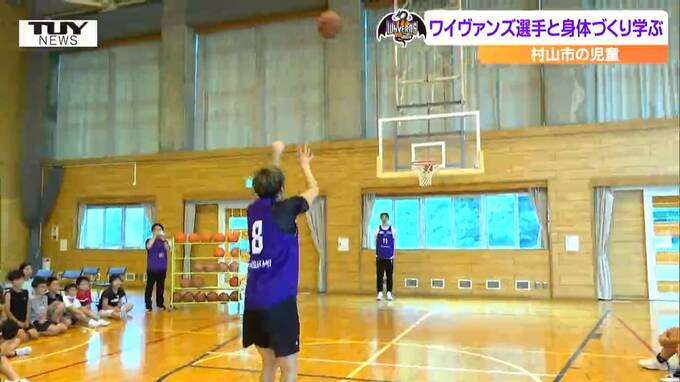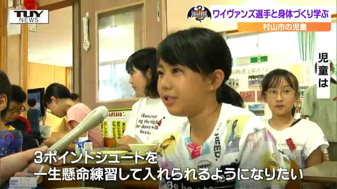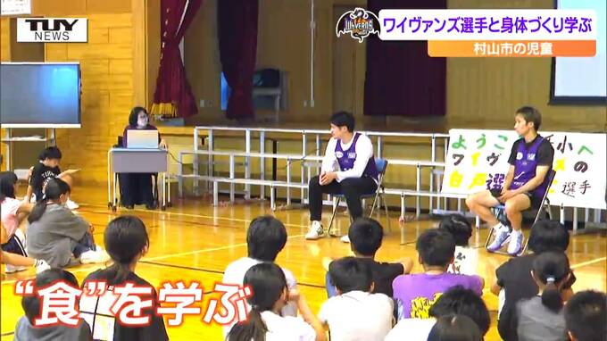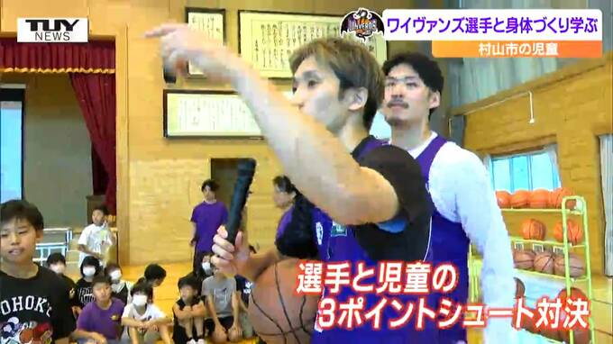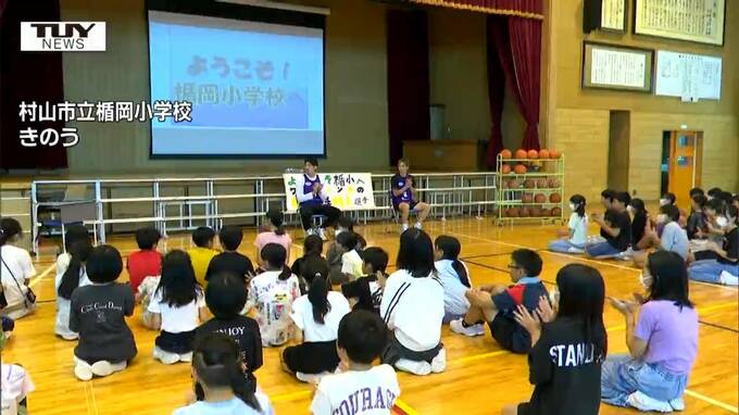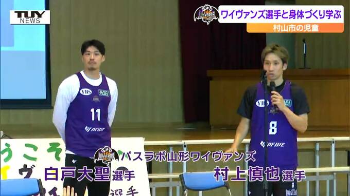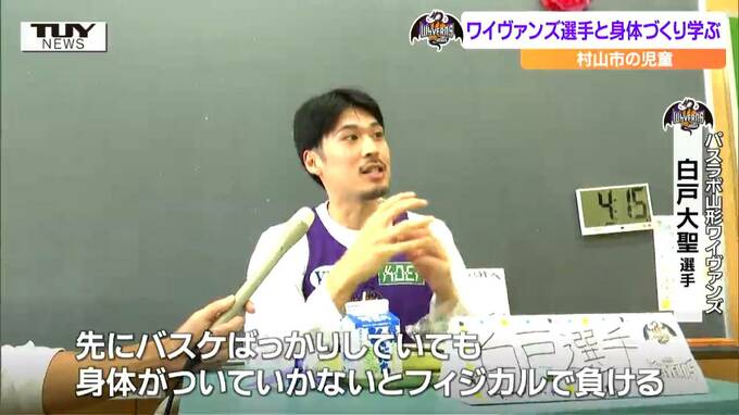 村山市の小学校にプロバスケットボールチーム山形ワイヴァンズの選手が訪れ、児童が選手と交流しながら、強くて大きな身体を作るために大切なことを学びました。