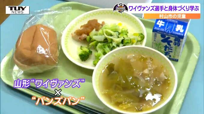 この日の給食はたんぱく質を多く含んだ鶏肉を、山形ワイ”ヴァンズ”の名前にかけ、”バンズ”パンで挟んだメニューです。