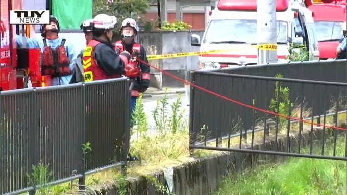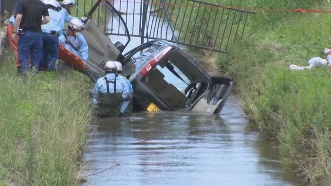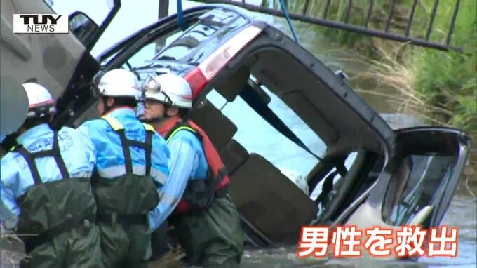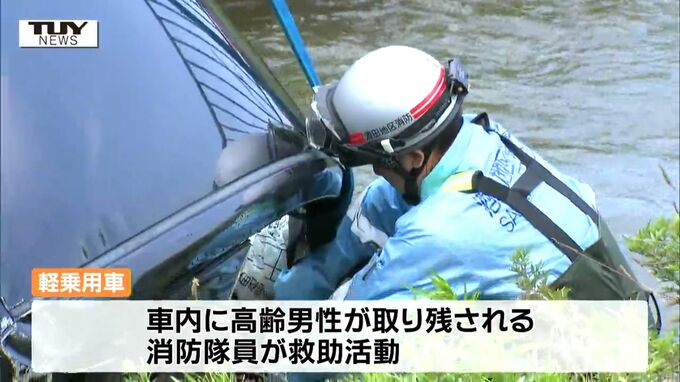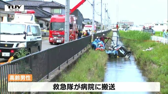 消防によりますときょう午前11時前、酒田市四ツ興野で、軽乗用車が水路に転落したと消防に通報がありました。車内には高齢の男性が取り残されていて、消防隊員が救助活動を行いました。