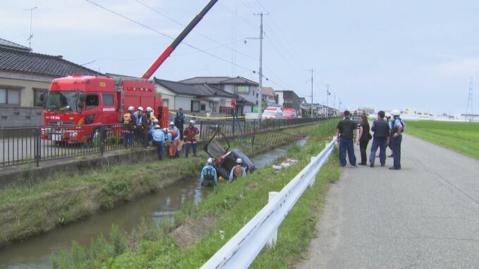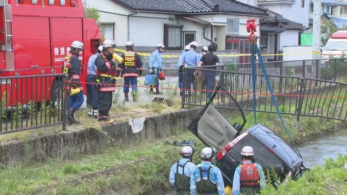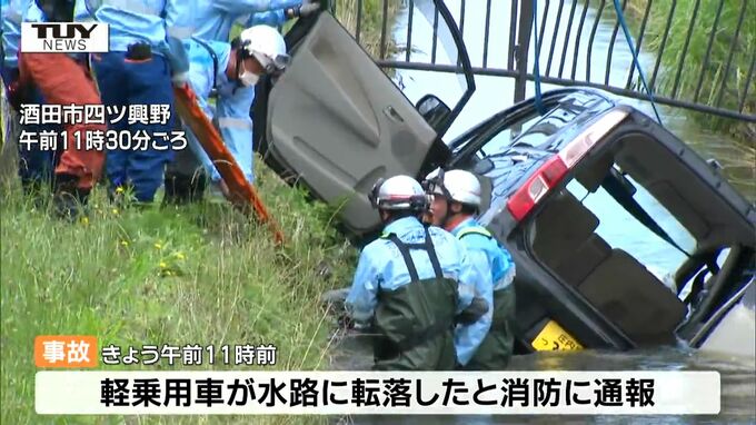 きょう午前、酒田市で、軽乗用車が水路に落ちる事故があり、車内に取り残された高齢の男性の救助作業が行われました。