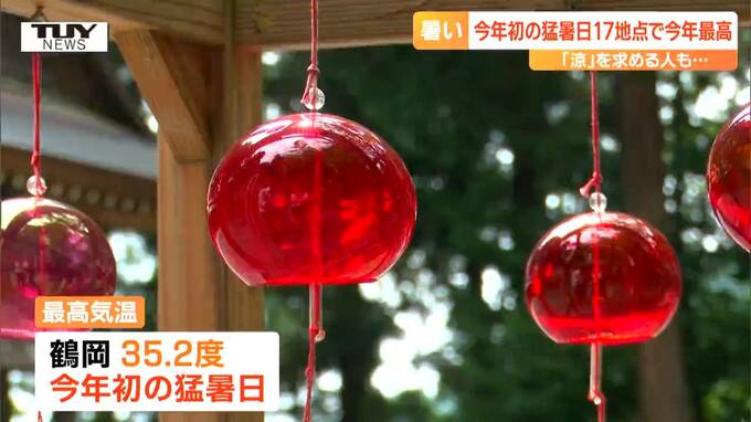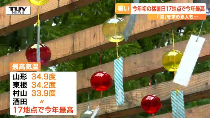 このほか、山形で34.9度、東根で34.2度、村山と酒田で33.9度となるなど、17の地点で今年最高の気温となり、酒田市飛島を除くすべての地点で30度以上となりました。