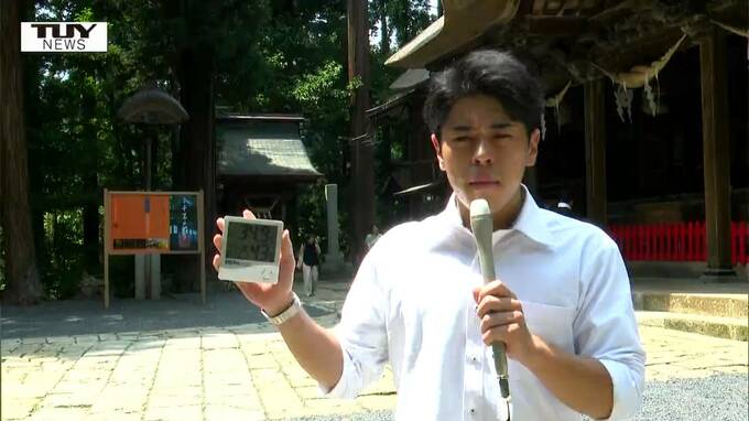 藤井響樹アナウンサー「南陽市の熊野大社にきています。午後1時前ですが、手元の温度計で34.9℃となっています。思わず目をしかめてしまうような強い日差しが降り注いでいます」