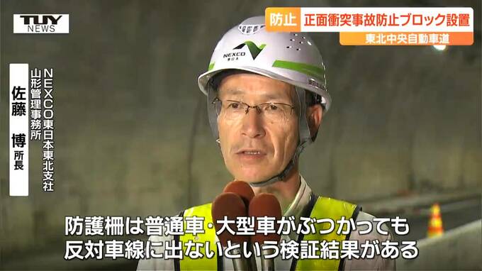 ネクスコ東日本 東北支社 山形管理事務所 佐藤博 所長「この防護柵は普通車・大型車がぶつかっても反対車線に出ないという検証結果が出ている。安全・安心を確保するためにこのような防護柵が出来ればより一層お客様に安全に走行してもらえる」