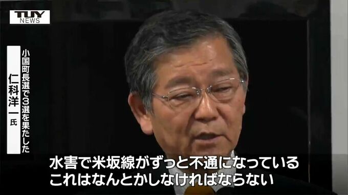 小国町長選 3選を果たした 仁科洋一氏「水害で米坂線がずっと不通になっている。これはなんとかしなければならない。国が地方創生や地方の活性化を目指すのなら、どうしても地方のローカル線をなくしてはいけないと思いを伝えている」