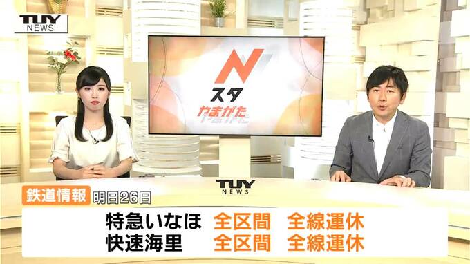 鉄道の情報です。JR東日本によりますとあす26日は、特急いなほが全区間で全線運休。快速海里も全区間で全線運休ということです。
