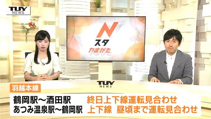 羽越本線は鶴岡駅と酒田駅の間は始発から終日上下線で運転見合わせ、あつみ温泉駅から鶴岡駅の間は始発から上下線ともに昼頃まで運転を見合わせるということです。