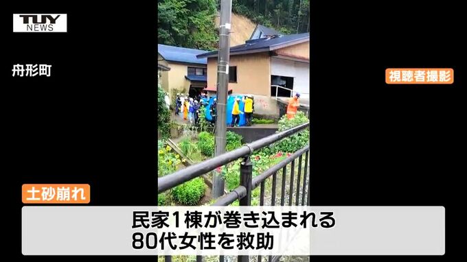 【山形】一夜明け被害が顕著に 酒田では川沿いの広範囲で今も浸水 舟形では土砂に巻き込まれた高齢女性が搬送 2024年7月26日(金) 12:03 国内 雨の影響で土砂崩れもおきました。 舟形町では、民家1棟が土砂に巻き込まれ、中から80代女性が救助され、病院に運ばれました。 救助された際、意識はあったということです。