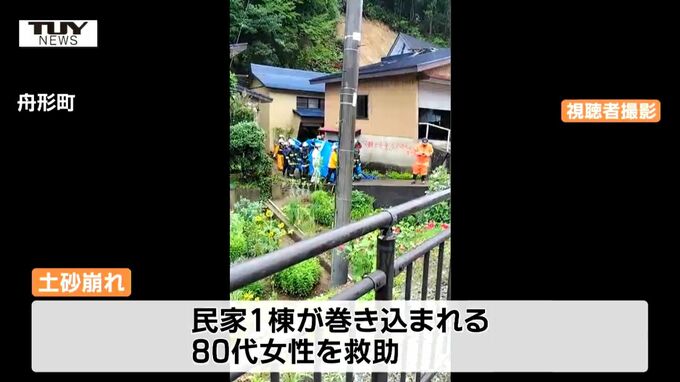 【山形大雨】県内で浸水・土砂崩れ・氾濫・孤立などが発生 一夜明け被害が顕著に 2024年7月26日(金) 17:25 国内 雨の影響で土砂崩れもおきました。 舟形町では、民家1棟が土砂に巻き込まれ、中から80代女性が救助され、病院に運ばれました。救助された際、意識はあったということです。