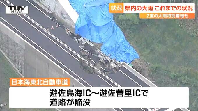 別の場所では、月光川にかかる高速道路、日本海東北自動車道の遊佐鳥海ICから遊佐菅里ICで道路が陥没しています。看板が落ちている様子も確認できます。