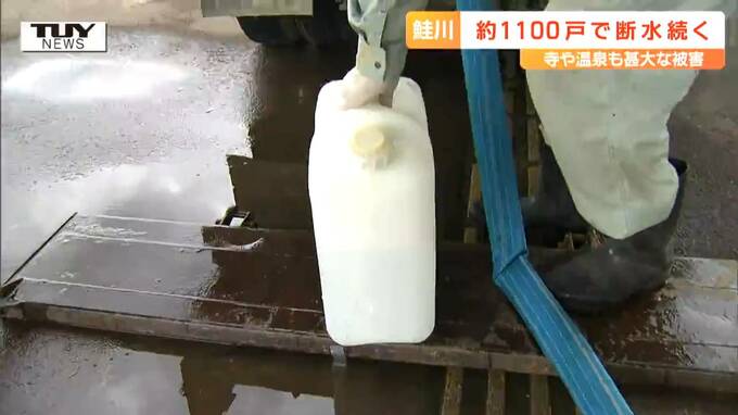 村では、水道管が壊れ、(きのう午前10時時点で)村全体のおよそ86%にあたる1132戸で断水が続いていて、9か所に給水所が設置されています。
