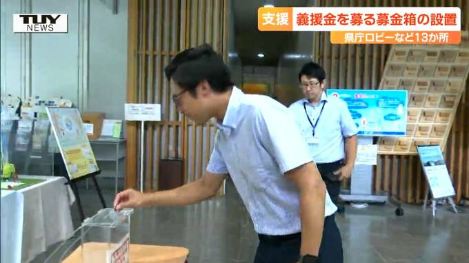 今回の大雨で被害を受けた人たちを支援しようと、義援金を募る募金箱の設置が、きょう始まりました。
