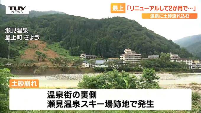 最上町の瀬見温泉です。温泉街の裏側にある瀬見温泉スキー場跡地で土砂崩れが発生し、道路をふさぎました。