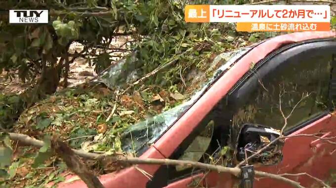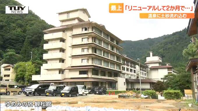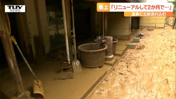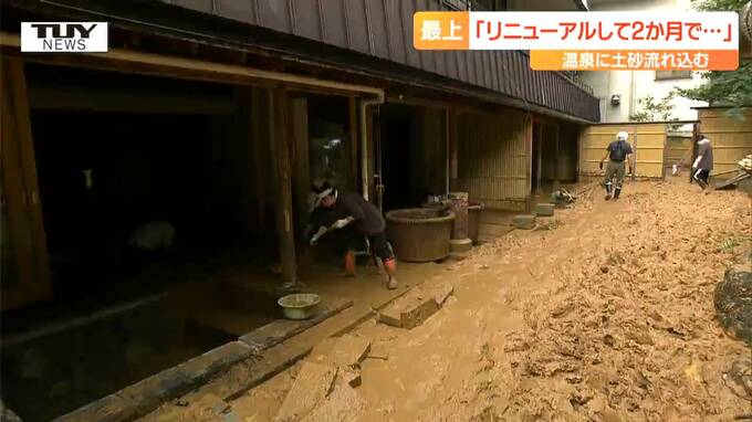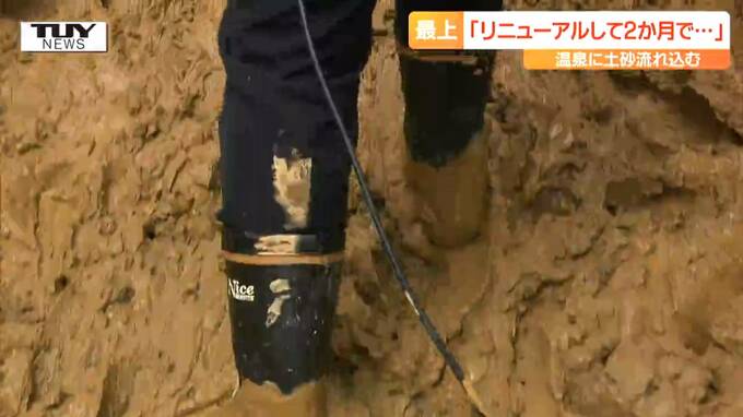 松浦亜実 記者「旅館の後ろにある山の斜面が崩れ落ち、土砂が流れ込みました。土砂はくるぶしぐらいまで溜まっていて、ねっとりして歩きにくいです」
