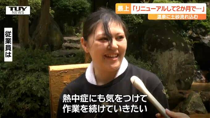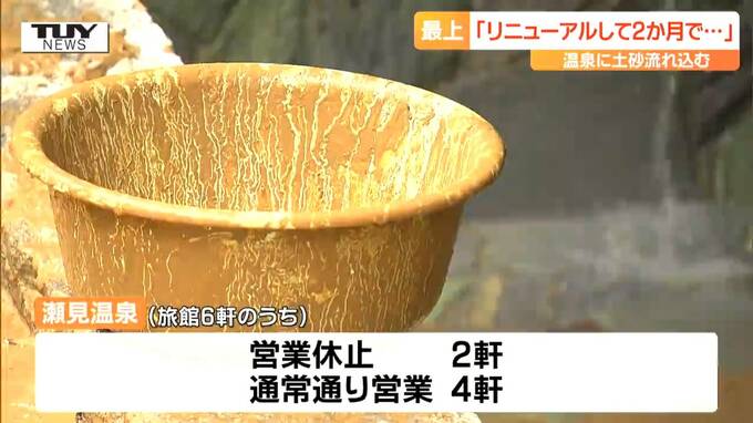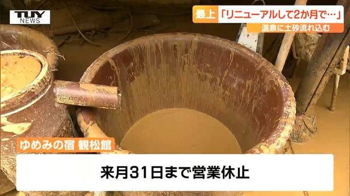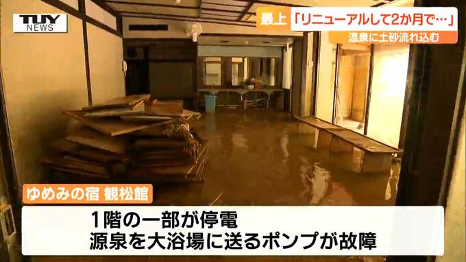 観松館の設備管理をする会社によりますと、このほかにも土砂の影響で1階の一部が停電しているほか、源泉を大浴場に送るポンプが水没し、故障しているということです。
