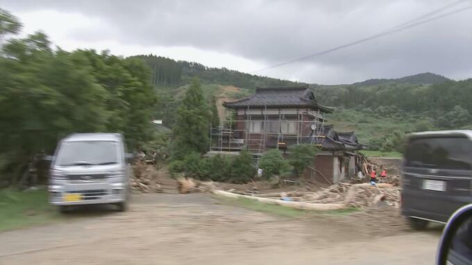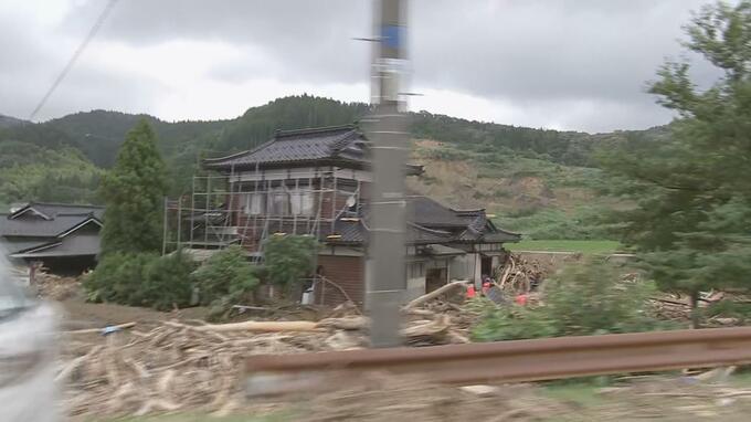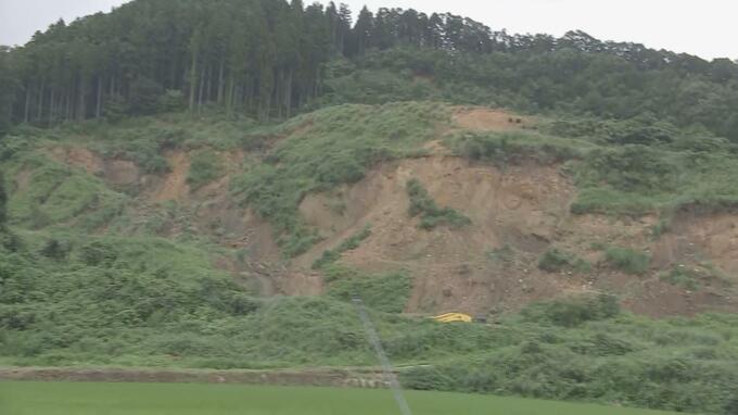近くの山が崩れ、木や土砂が下の田んぼなどに流れ出ていた。