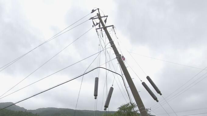 電柱が傾き、電線は切れているところもあった。復旧には時間がかかる。