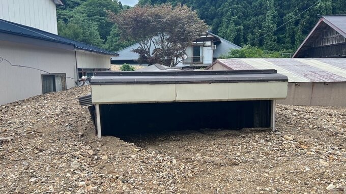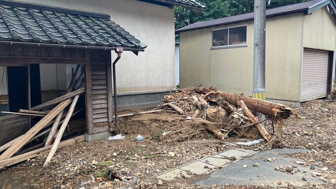 衝撃 大雨で被害の山形県酒田市北青沢地区の現状 地区全体が流木や土砂に襲われたか 2024年8月1日(木) 12:36 国内 ■住宅の様子は・・・ 大量の木が流されてきている。道路わきにも丸太が。 こちらはガレージだろうか。濁流と土砂のすさまじさを伝えている。 なんとかライフラインの復活を。作業員が汗を流す。
