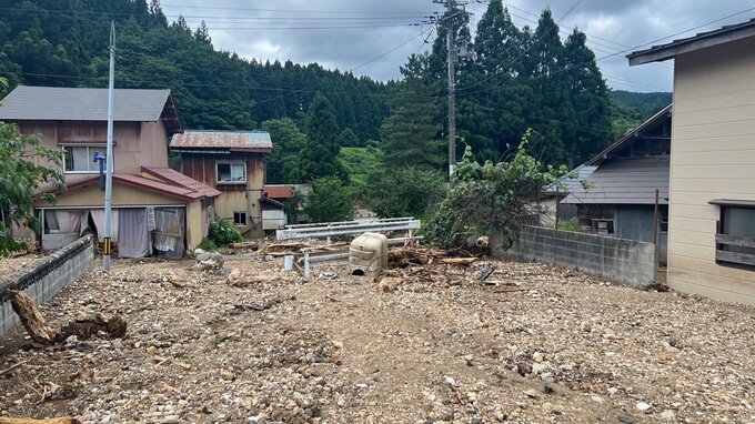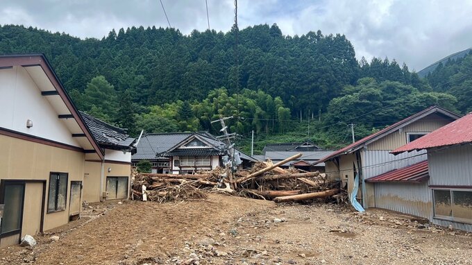 衝撃 大雨で被害の山形県酒田市北青沢地区の現状 地区全体が流木や土砂に襲われたか 2024年8月1日(木) 12:36 国内 ■町の通りは 地区の通りが、すべて土砂に埋もれてしまったようだ。 木々が流れ着いたのか。あまりの勢いに電柱も傾いている。