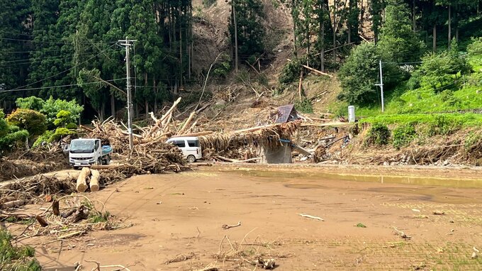 現場では、大雨のあと行方がわからなくなっていた酒田市の女性の捜索が行われていて、警察は、遺体の身元の特定などを進めています。