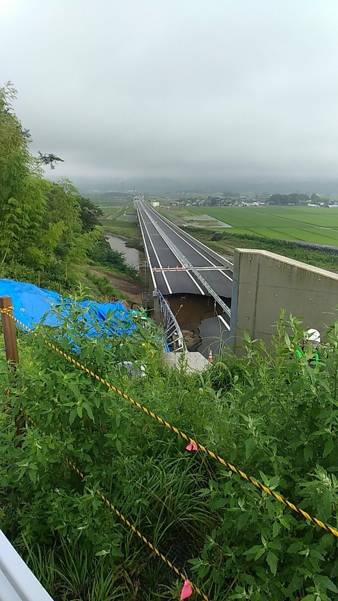「令和6年7月25日の大雨により、日本海東北自動車道の遊佐菅里ICから遊佐鳥海ICの区間において、路面陥没が確認され、7月25日11時00分より全面通行止めを実施しております」