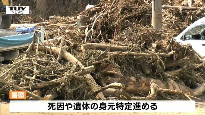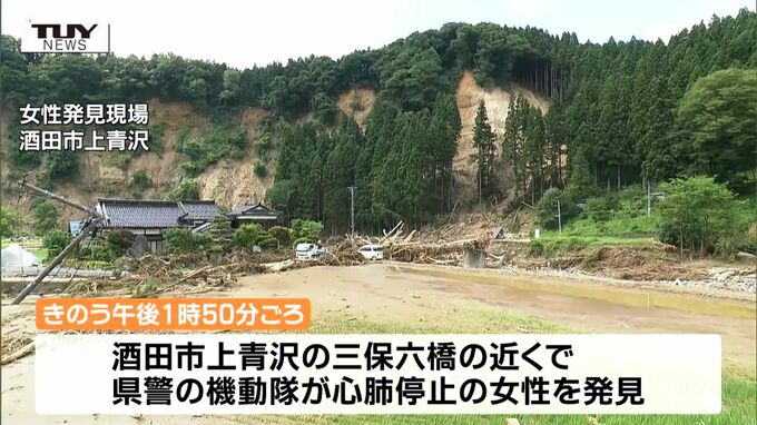 現場では、大雨のあと行方がわからなくなっていた酒田市の女性の捜索が行われていて、警察は、遺体の身元の特定などを進めています。