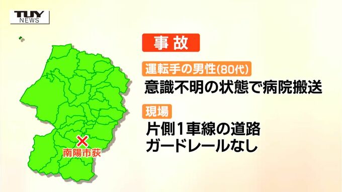 きょう午後1時20分頃、山形県南陽市で軽トラックが道路から土手に転落する事故がありました。運転手の男性が意識不明の状態で病院に搬送されています。