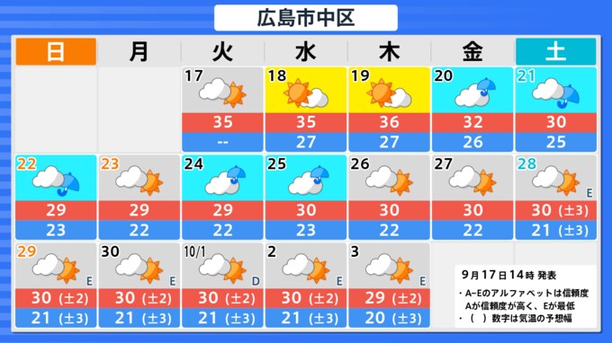 【台風情報】台風14号(プラサン) 沖縄本島・奄美地方などに接近する見込み 台風進路予想・各地の天気は 2024年9月17日(火) 14:29 国内 ■広島の長期天気は 広島市の今後の予測(TBS NEWS DIG Powered by JNNより) 広島市の今後の予測(TBS NEWS DIG Powered by JNNより)