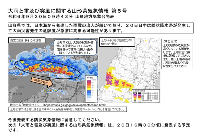 山形県 線状降水帯発生のおそれあり 大雨災害の危険性高まる可能性 気象庁画像発表 2024年9月20日(金) 09:53 国内 雨の降り方について、気象庁が画像で発表。 日本海から発達した雨雲の流入が続く。線状降水帯発生のおそれがあり、大雨災害の危険性高まる可能性。 ※画像は気象庁より