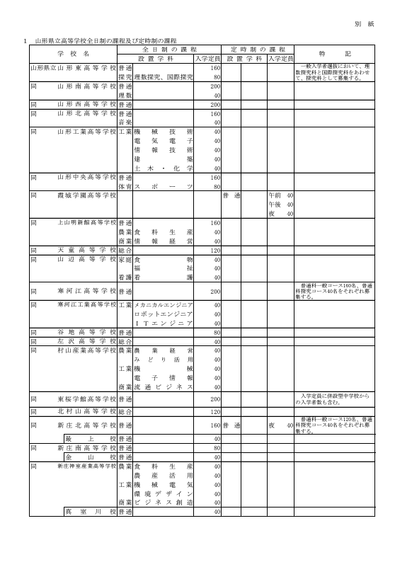 高校受験2025 来年度の高校入学試験の定員は 山形県立高等学校・山形県立特別支援学校高等部 入学者募集定員発表 2024年10月24日(木) 10:55 国内 山形県は、令和7年度、山形県立高等学校及び山形県立特別支援学校高等部の入学者募集について発表しました。 各学校の定員については、画像をご覧ください。 ■県立高等学校(村山・最上地域)
