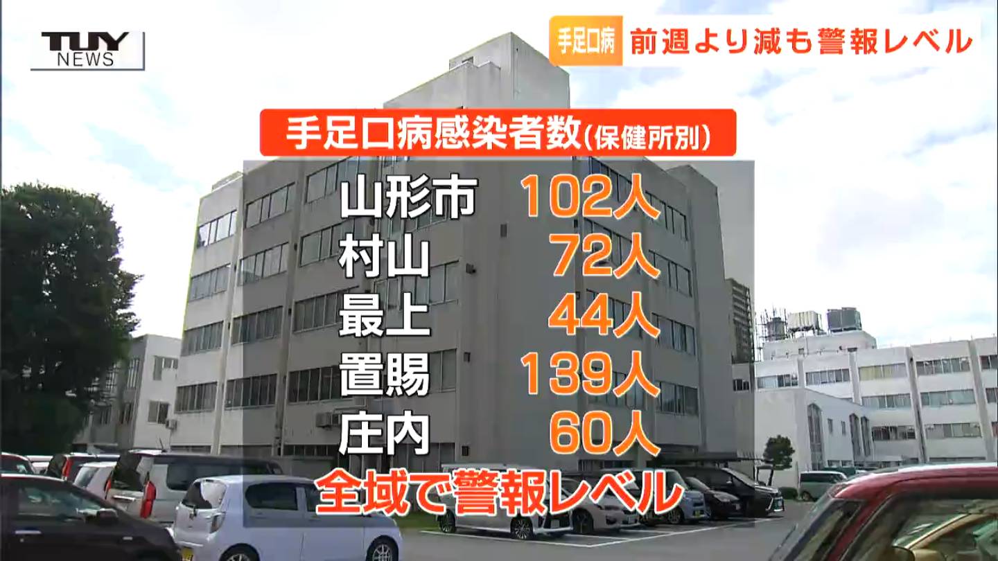 保健所別では、山形市が102人、村山が72人、最上が44人、置賜が139人、庄内が60人となっていて、全域で警報レベルが続いています。