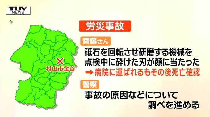 きのう午後、村山市の工場で、56歳の男性が、砥石を回転させ研磨する機械の点検中に壊れた刃が顔に当たりました。
