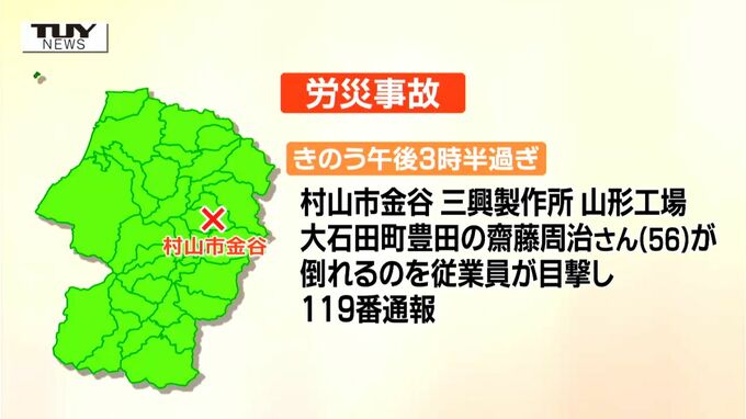 警察によりますと、きのう午後3時半過ぎ、村山市金谷の三興製作所(さんこうせいさくしょ)山形工場で、大石田町豊田の齋藤周治(さいとう・しゅうじ)さん(56)が倒れるのを近くの従業員が目撃し119番通報しました。