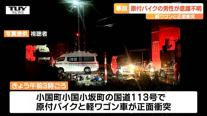 国道113号で原付バイクと軽ワゴン車が衝突 原付バイクに乗っていた大学生(20)が意識不明の重体(山形・小国町) 2024年11月22日(金) 18:26 国内 きょう未明、小国町の国道113号で原付バイクと軽ワゴン車が衝突する事故があり、原付バイクに乗っていた大学生の男性が意識不明の重体となっています。警察によりますときょう午前3時ごろ、小国町小国小坂町(…