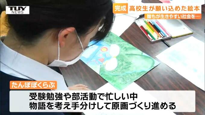 みな高校3年生とあって受験勉強や部活動で忙しい中、ラーワ―さんらの協力を受け、みんなで物語を考え、手分けして原画づくりを進めました。