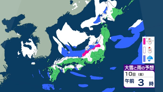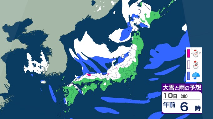 大雪のおそれ いつ・どこで雪が降る?【降雪シミュレーション】9日から10日にかけ東北から西日本の日本海側を中心に警報級の大雪となる可能性 2025年1月7日(火) 16:28 国内 10日(午前)の雪と雨の予報