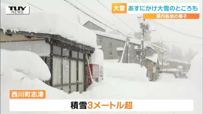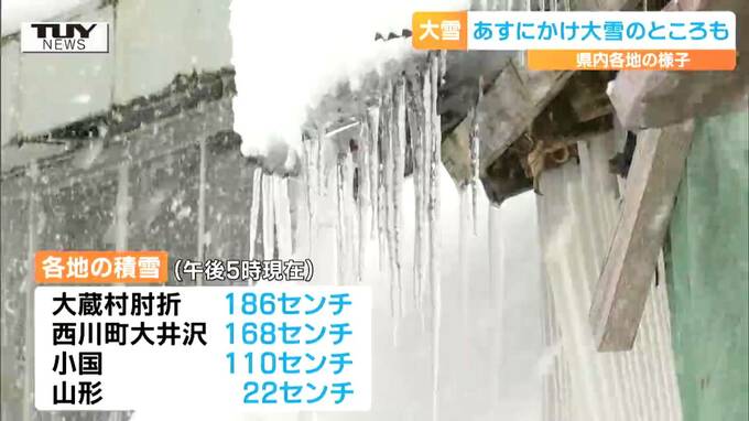 県内各地の積雪は午後5時現在で大蔵村肘折で186センチ、西川町大井沢で168センチ、小国で110センチなどとなっています。