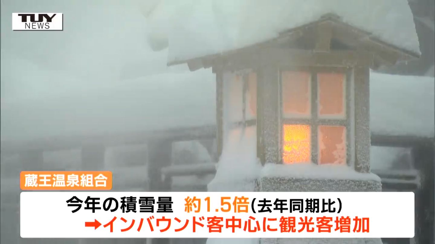蔵王温泉旅館組合によりますと、今年は積雪量が去年の同じ時期に比べおよそ1.5倍に増えていて、海外からのインバウンド客を中心に観光客が増えてきていると