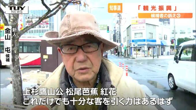 新人 金山屯 候補「米沢の上杉鷹山公、それから松尾芭蕉、紅花、これだけでも十分なお客を引く力はあるはずなんです。なんにも利用してないじゃない」