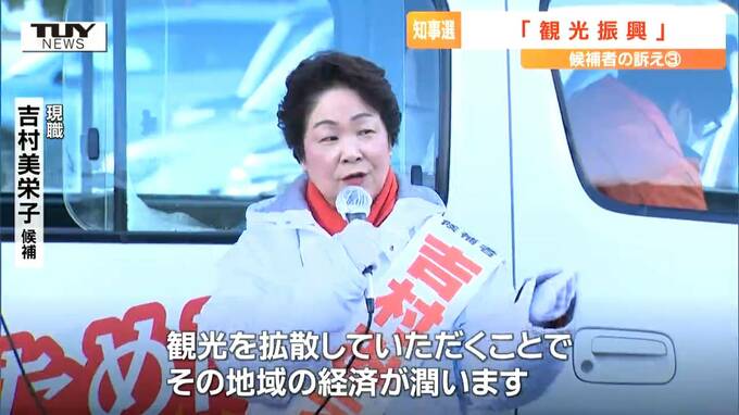 現職 吉村美栄子 候補「観光を拡散していただくことで、その地域の経済が潤います。観光交流、一生懸命、がんばっていきたいと思います」