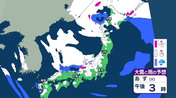 大雪情報 いつ・どこで雪が降る?【降雪シミュレーション】4日から5日にかけて北日本から西日本では大雪に警戒 24時間降雪量は? 風・波の予想も 東北・山形の今後も 2025年2月3日(月) 21:29 国内 ■4日(午後)の雪と雨の予報