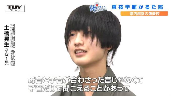 東桜学館高校 かるた部 土橋晃生 さん(1年)「音になる前の音みたいなものがあるんです。かるたで1字決まりを意識して取ろうとすると、たまに母音と子音が合わさった音じゃなくて子音だけで聞こえることがあって、そこに1字決まりの楽しさを感じた」