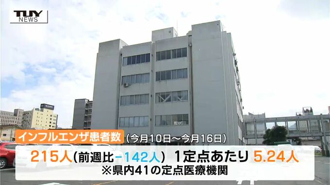 県衛生研究所によりますと、今月16日までの1週間に県内41の定点医療機関から報告があったインフルエンザの患者数は、前の週より142人少ない215人でした。