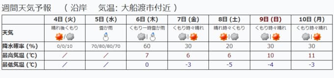 週間予報です。きょうは晴れのちくもり、あすとあさっては雪や雨となりますが、その後はまた晴れマークが続いています。
