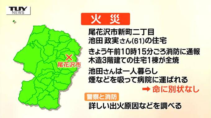 警察や消防によりますと、火事があったのは尾花沢市新町2丁目の池田政実さん(61)の家で、きょう午前10時15分頃、郵便局の職員から「住宅が燃えているようだ」と消防に通報がありました。
