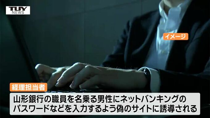 経理担当者がガイダンスに従ったところ、山形銀行の職員を名乗る男性にネットバンキングのパスワードなどを入力するように言われ、偽のサイトに誘導されたということです。