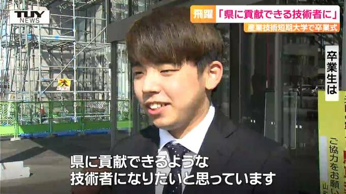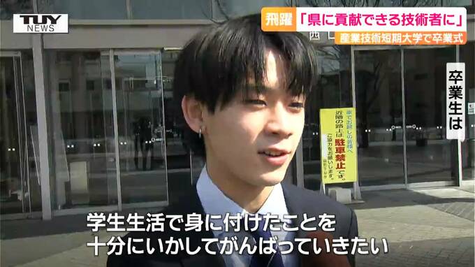 卒業生「授業の内容とか難しい部分もあったが、友達と乗り越えて無事卒業できました。県に貢献できるような技術者になりたいと思っています」