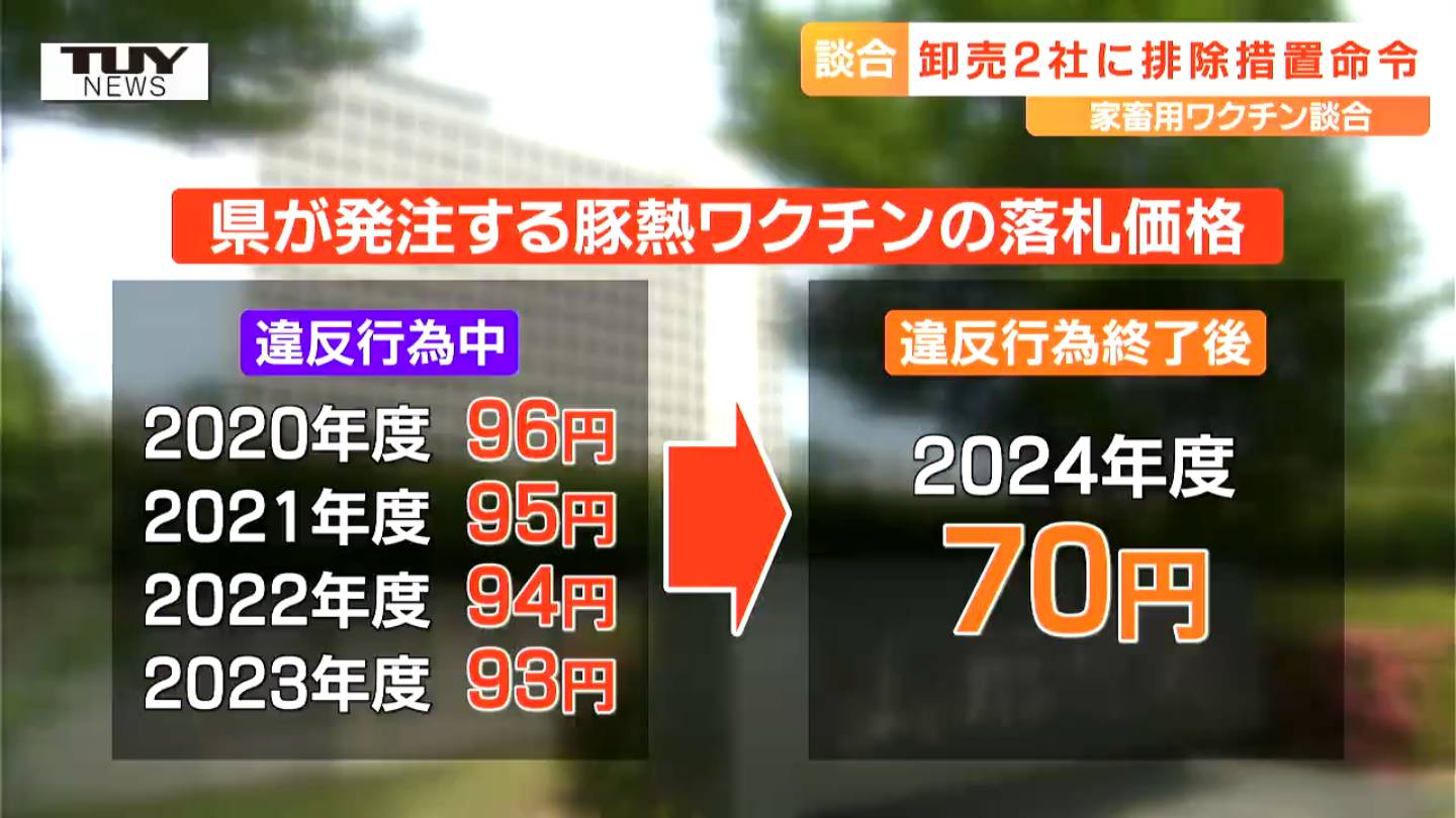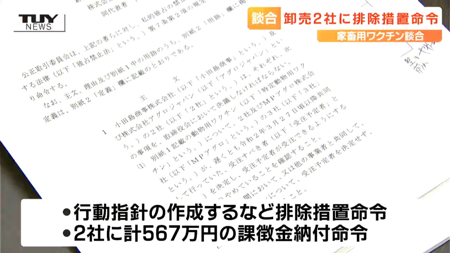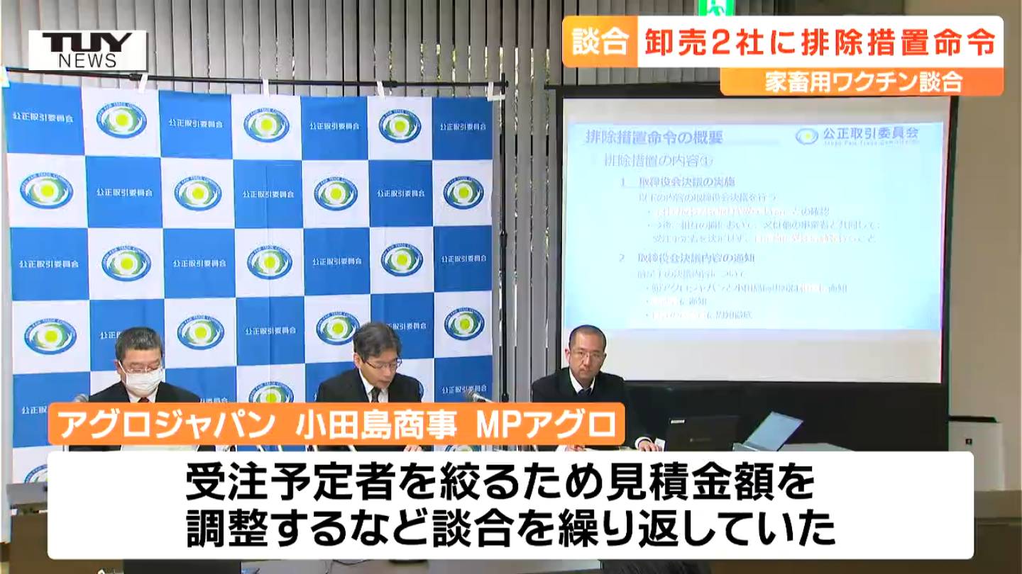 公正取引委員会によりますと、この2社と北海道に本社を置くMPアグロの合わせて3社は、2020年から2023年にかけ、県が発注する家畜用ワクチンの入札において、受注予定者を絞るためあらかじめ見積金額を調整するなど、談合を繰り返していたということです。
